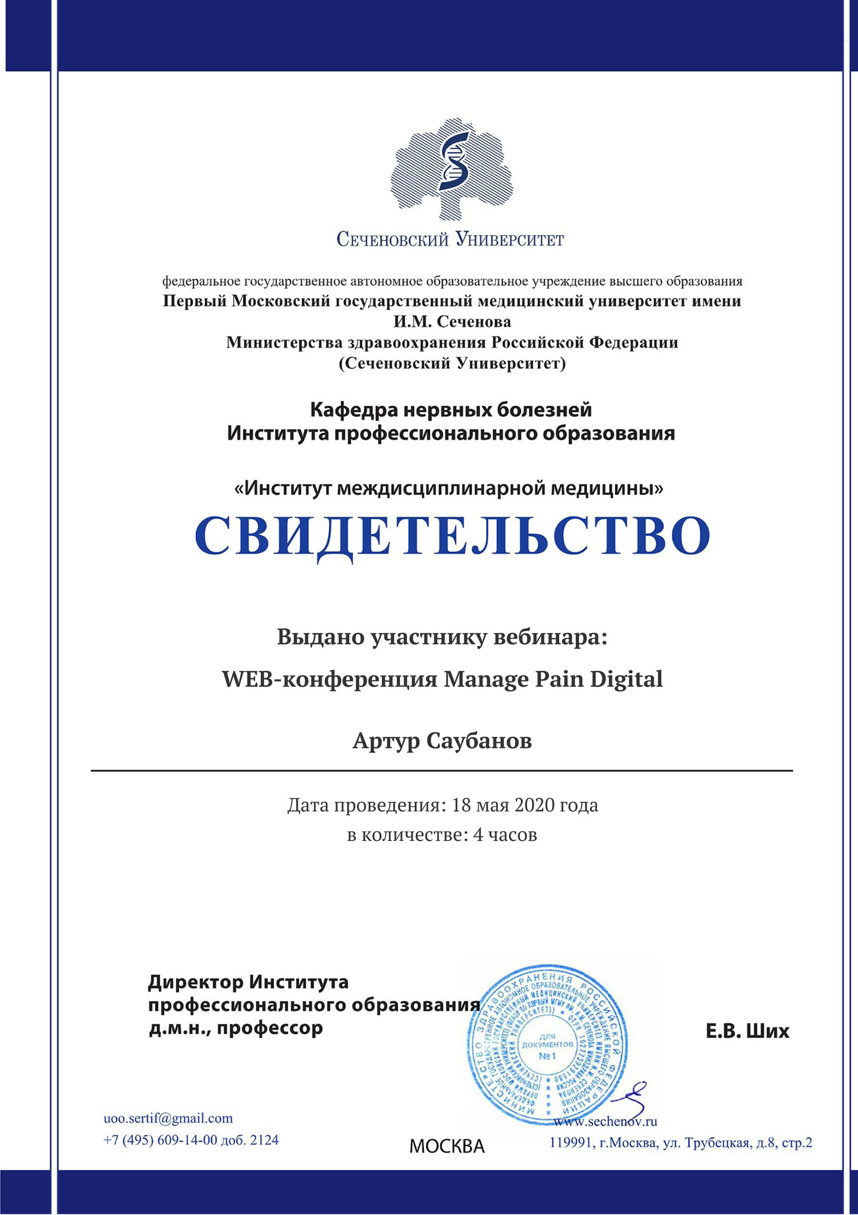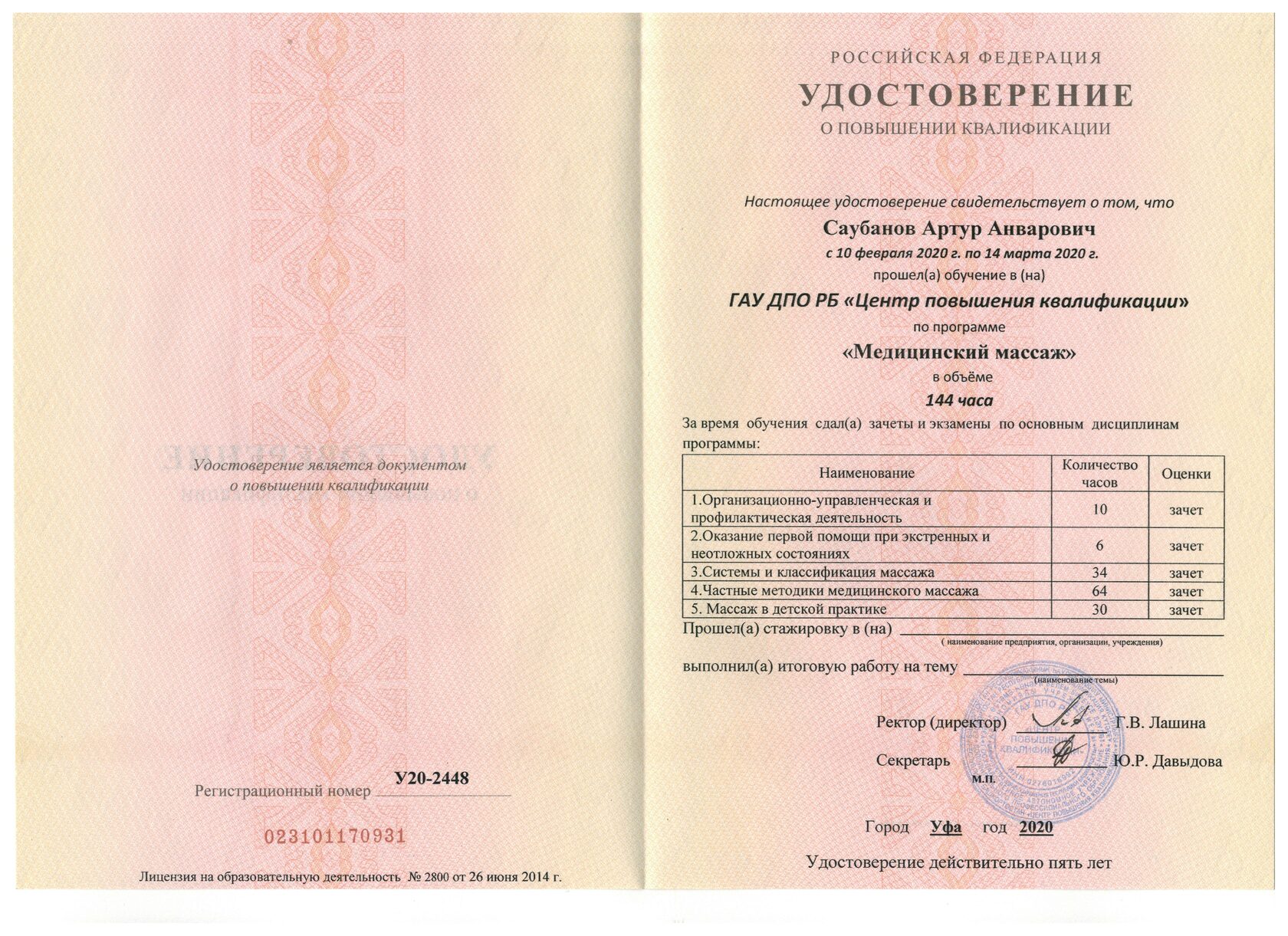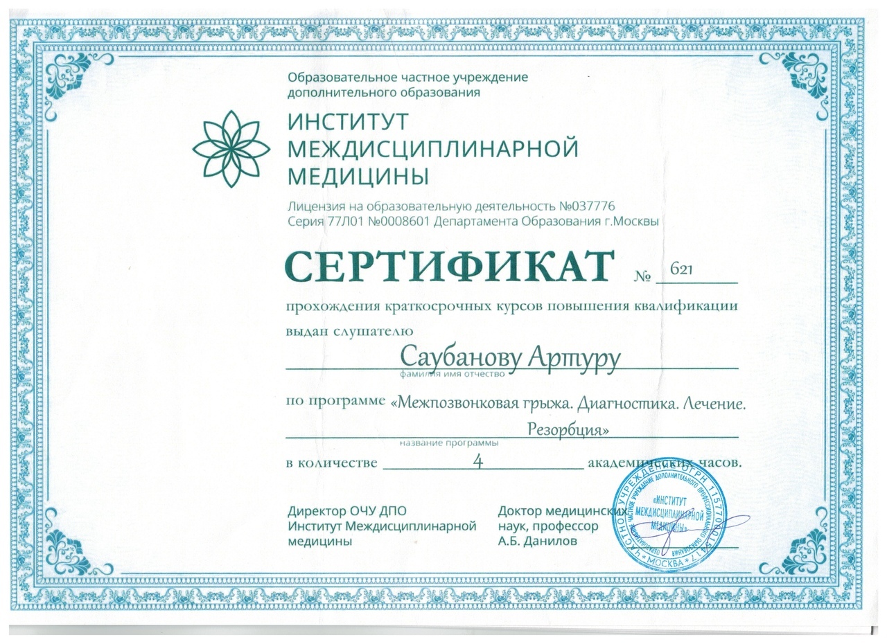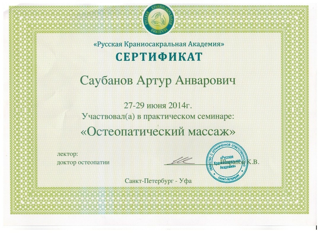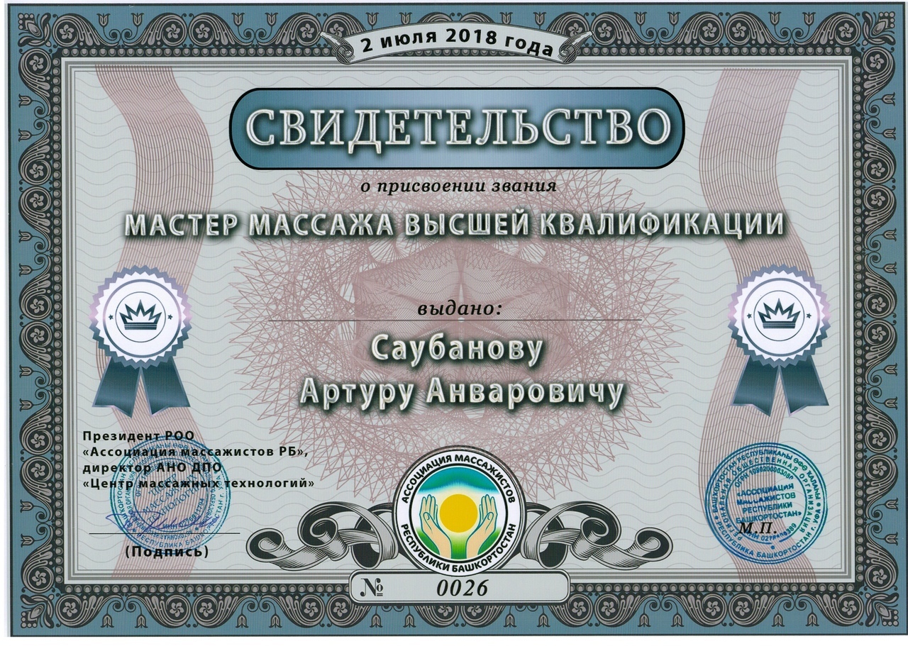 2010 году прошел сертификацию в ГАУ ДПО РБ «Центра повышения квалификации» по циклу «Медицинский массаж»