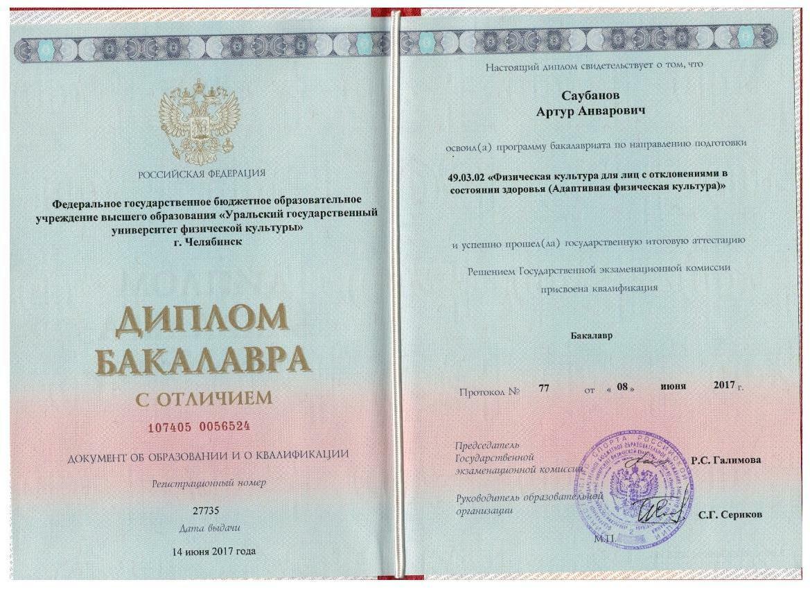 2011-2017 Стерлитамакского института физической культуры (филиал) УралГУФК по специальности «Адаптивная физическая культура для лиц с отклонением в состоянии здоровья»