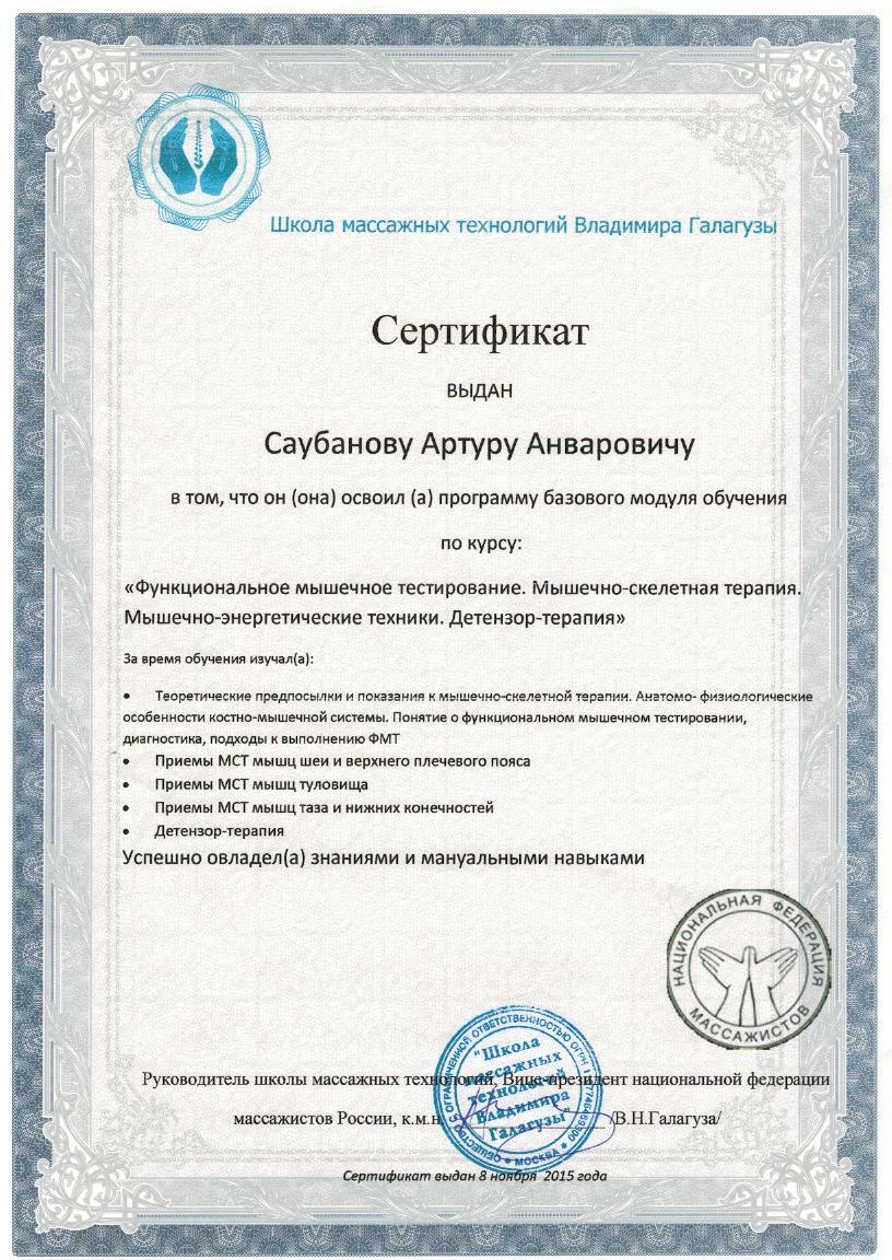 2015 году прошел сертификацию в ГАУ ДПО РБ «Центра повышения квалификации» по циклу «Медицинский массаж»