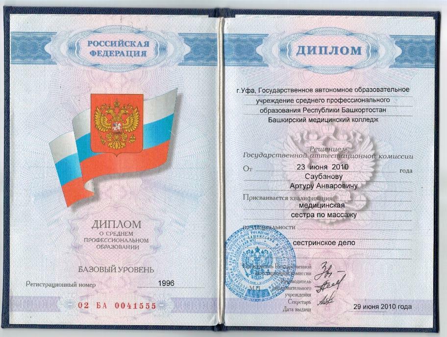 2007 по 2010 годы, проходил обучение в Башкирском медицинском колледже (г.Уфа) по специальности «Сестринское дело». Присвоена квалификация «Медицинская сестра по массажу»