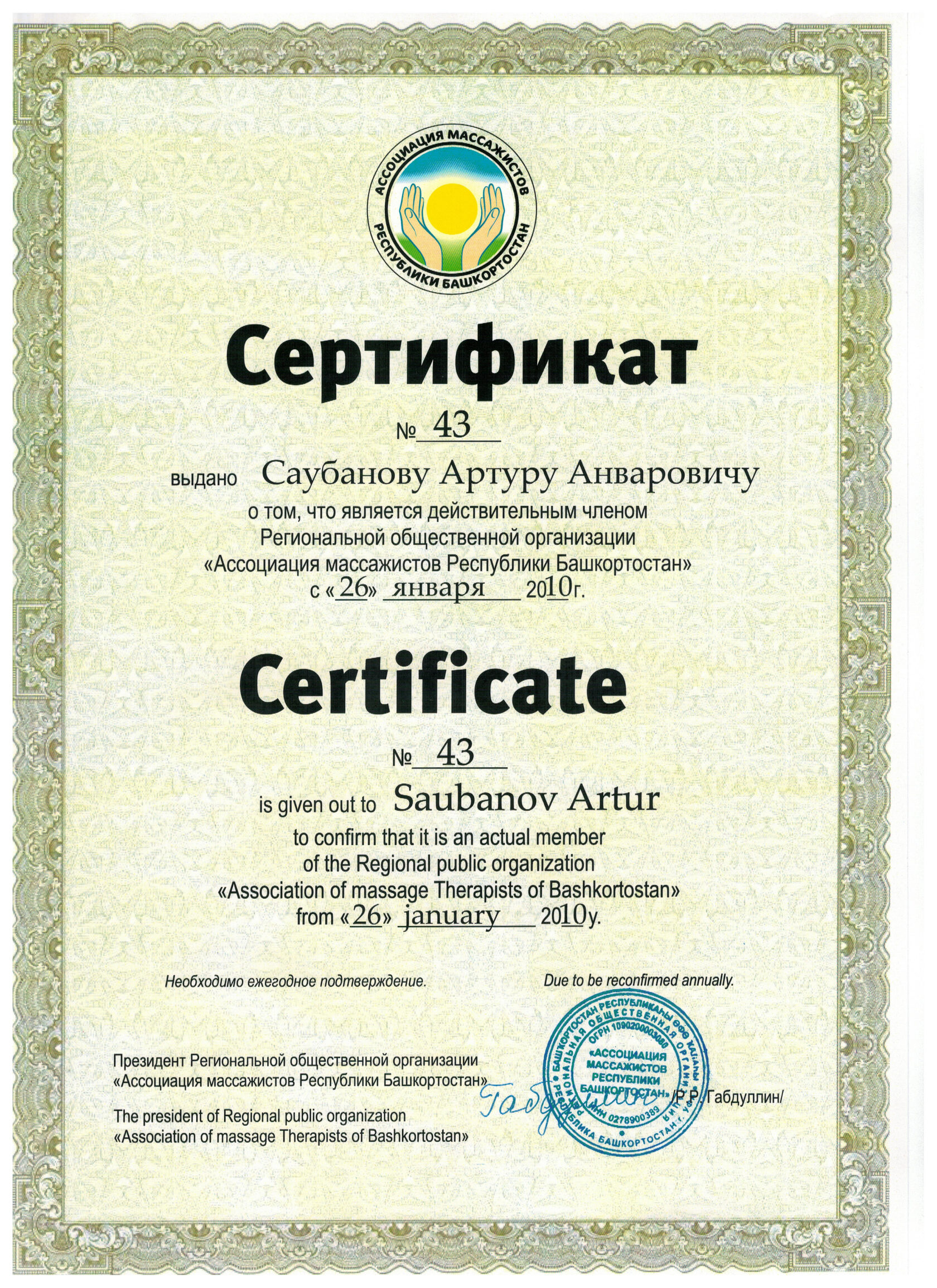 Член ассоциации массажистом Республики Башкортостан,